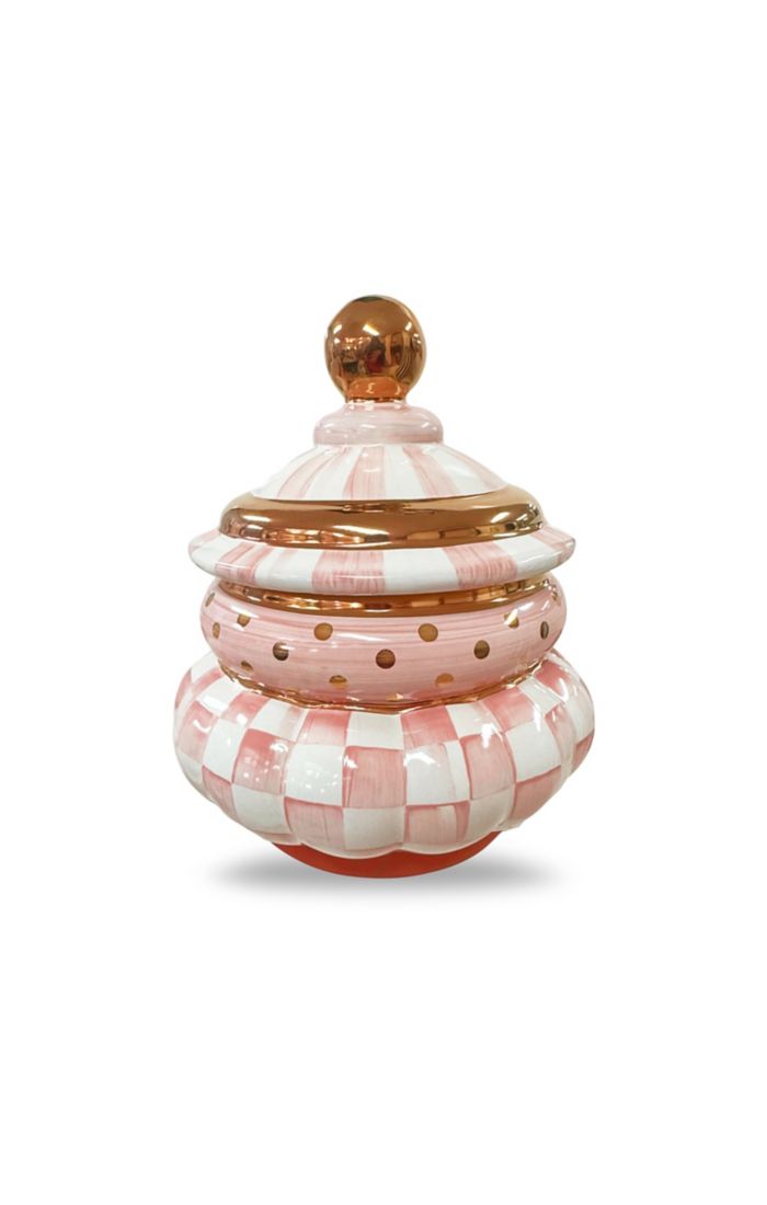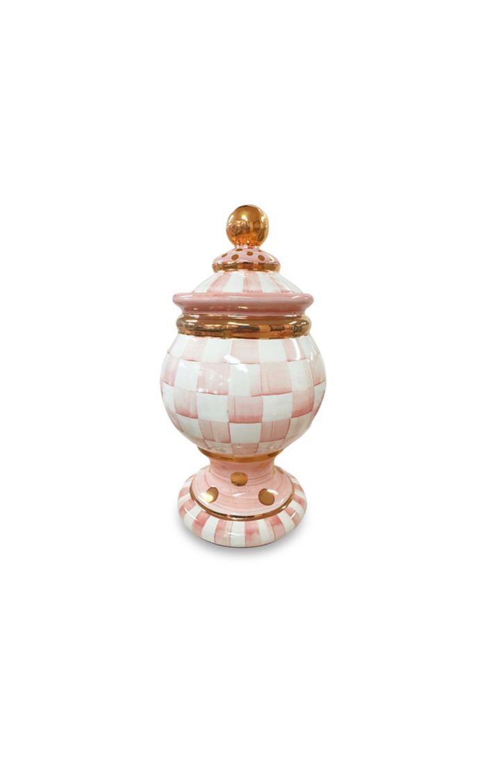 Put your good taste on display with our ceramic Rosy Check Ceramic Canisters. Featuring hand-painted stripes, dots, and checks, and trimmed with gold lustre by our master artisans in Aurora, New York, each one stores just about anything, from pantry staples to office supplies, with style. Pair it with the other collections and canisters to make an interesting set of shapes.