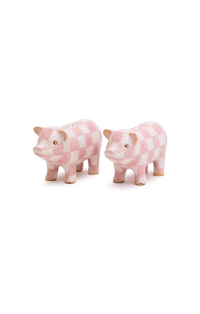 Charm every dinner guest with this ceramic Rosy Pig Salt & Pepper Set. Decorated with pink and white checks and finished with gold lustre.