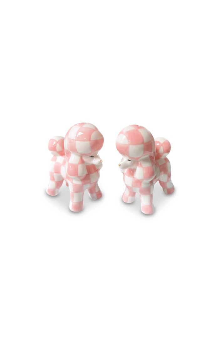 Charm every dinner guest with this ceramic Rosy Poodle Salt & Pepper Set. Decorated with pink and white checks. Dolomite. Pieces may vary due to the handmade nature of each product. Imported.