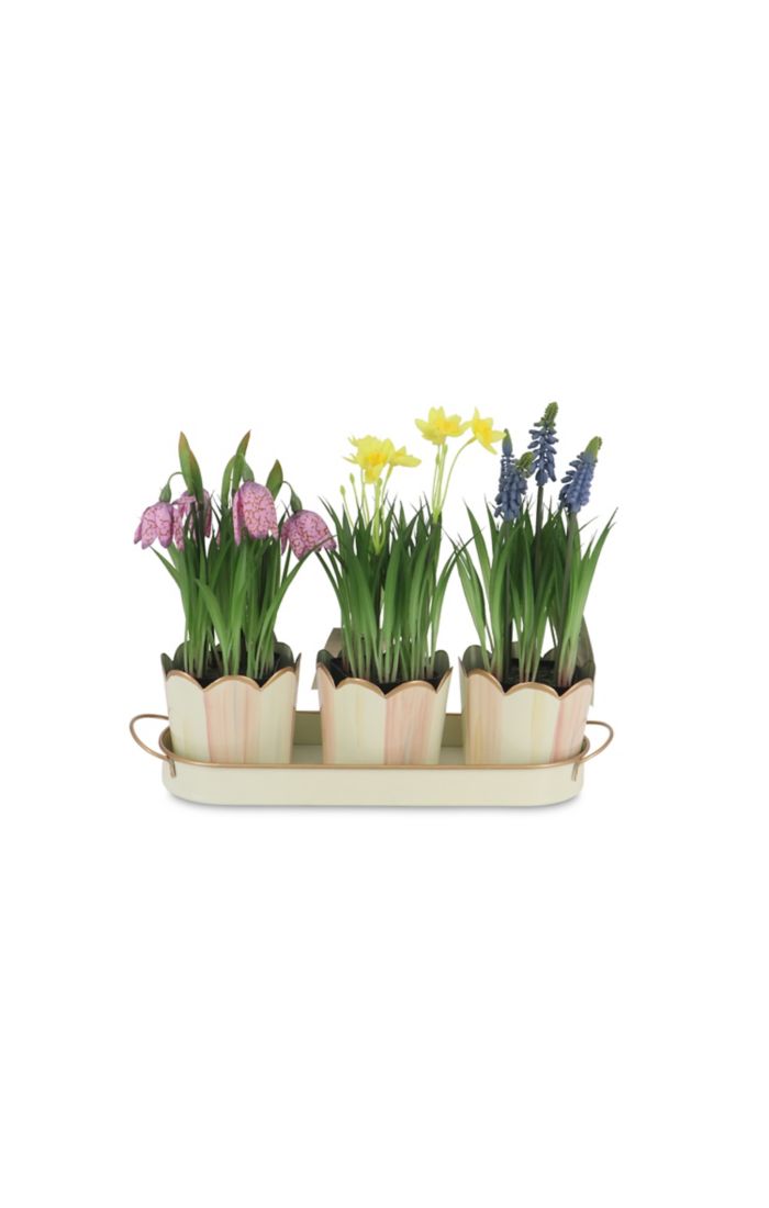 This Rosy Stripe Triple Potted Blooms is always full and fresh. Presented in pink and white striped potted tray. Metal vessel with artificial florals, styrofoam, and polyester. Pieces may vary due to the handmade nature of each product. Imported.
