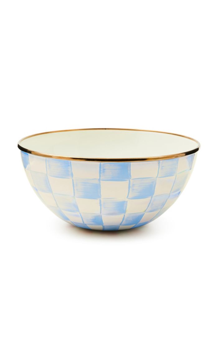 Heavy-gauge, hand-glazed steel underbody with hand-painted Sky Blue Checks, rimmed in bronzed stainless steel. Pieces may vary due to the handmade nature of each product. Imported.