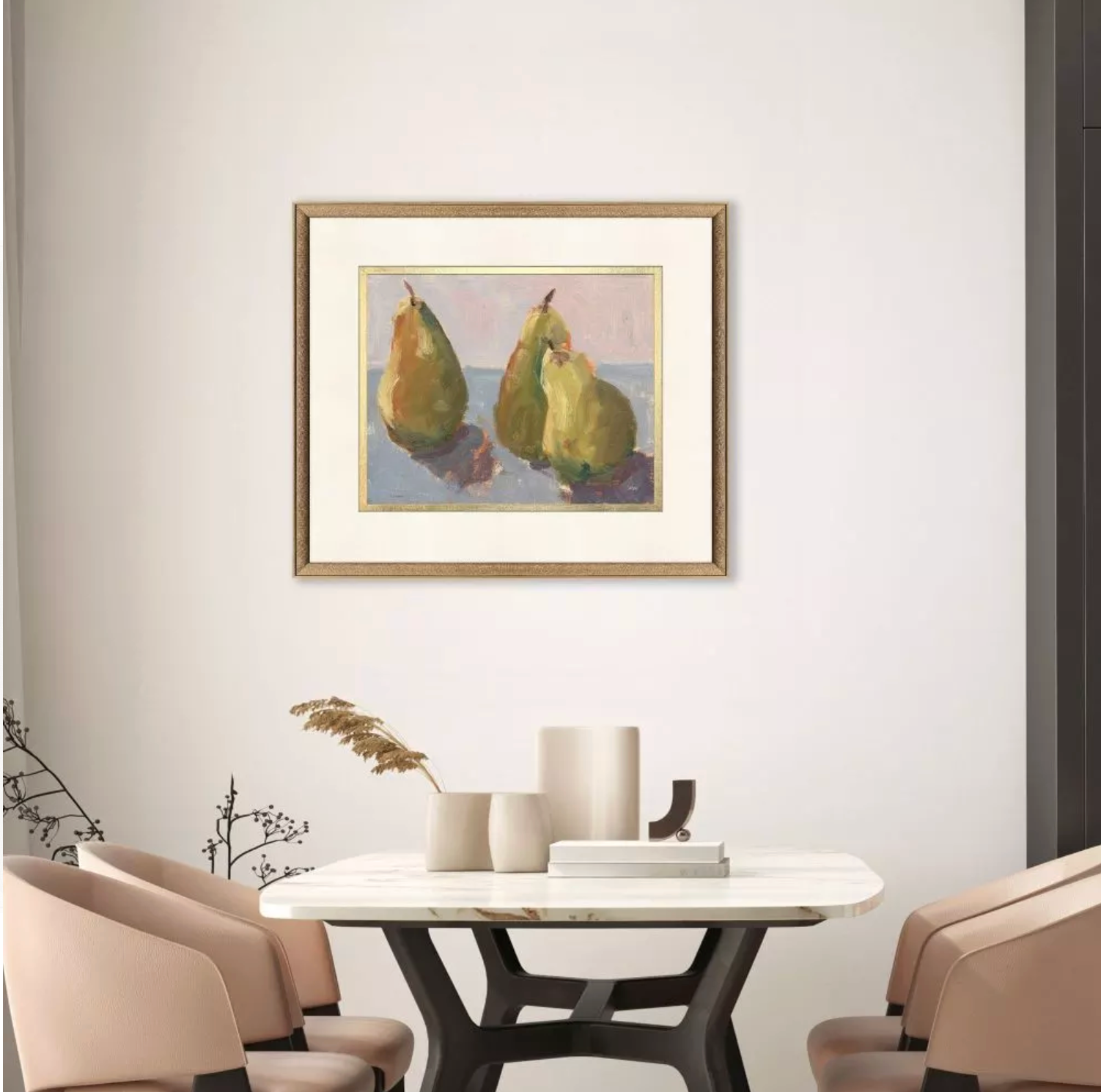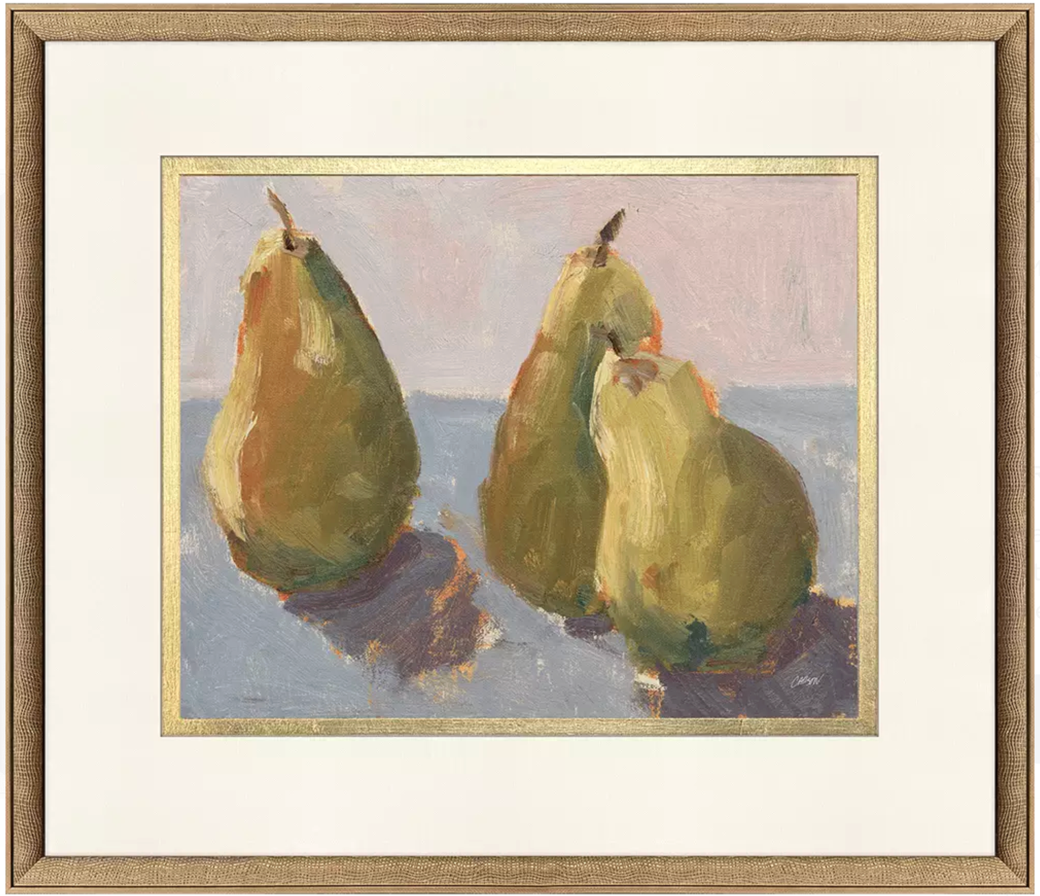 A traditional still life is accented with hand applied gold leaf matting. Frame in an antique gold wood with embossed weave pattern and charcoal side.