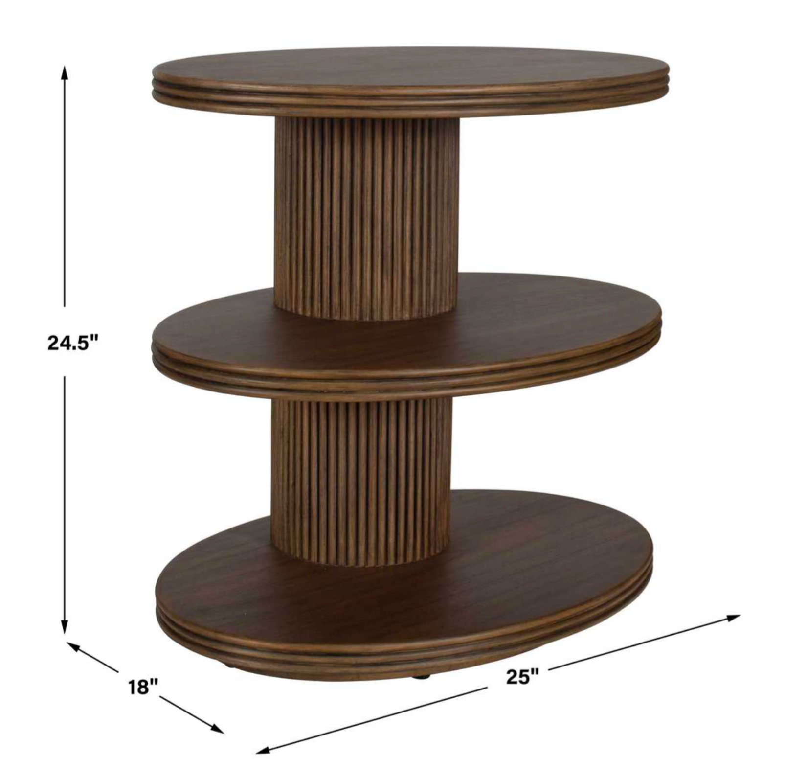 Handcrafted from mindi wood with a rich dark walnut finish, this distinctive side table features three oval tiers connected by elegantly fluted columns.