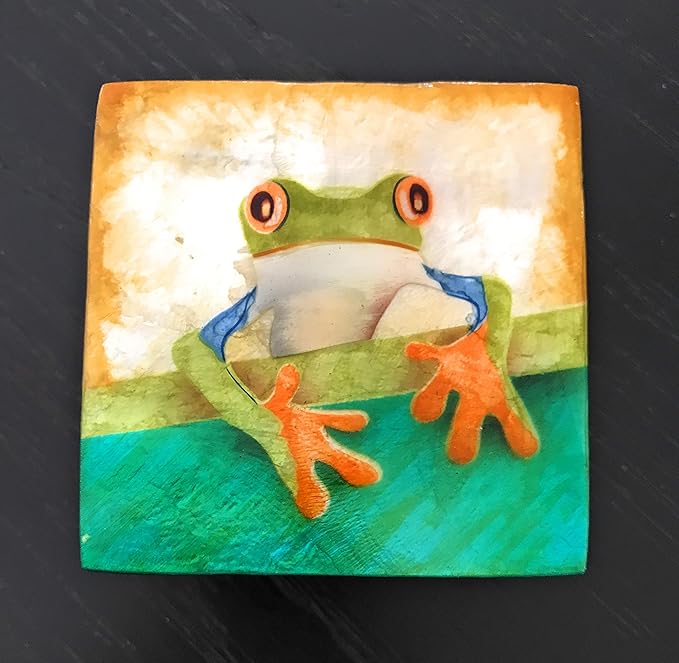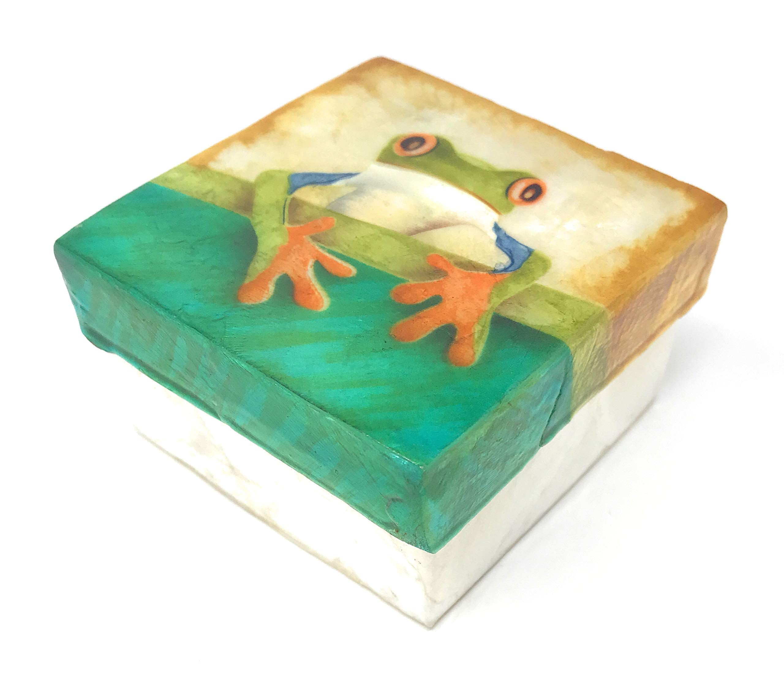 - A very cute tree frog is painted on the Capiz Shell Trinket Box with a beautiful iridescent effect.