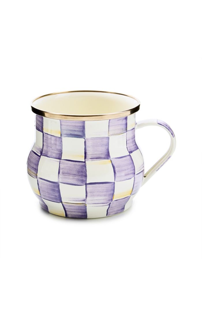 Hearty and handy, our handsome Violet Check Mug is perfect for a cup of hot chocolate or calming tea. Similar in theme to our signature Courtly Check enamel pattern, Violet Check features hand-painted purple checks that are rimmed in bronzed stainless steel.